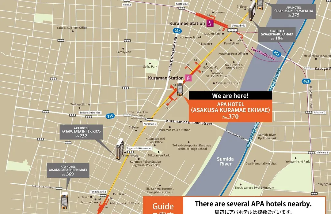 ستكون على مسافة 7 كم من برج طوكيو وعلى مسافة 2.3 كم من أمية يوكوتشو. سيجد المسافرون من رجال الأعمال طوكيو سكاي تري في غضون 25 دقائق سيرًا على الأقدام من الفندق. يقع هذا الفندق على مسافة قريبة من معرض سوميدا للأحياء المائية، بينما تقع محطة حافلات 石原二丁目 في غضون 10 دقائق سيرًا على الأقدام. سيجد الضيوف محطة مترو أساكو ساباشي على بعد نحو 5 دقائق سيرًا على الأقدام من Apa Hotel Asakusa Kuramae Ekimae.